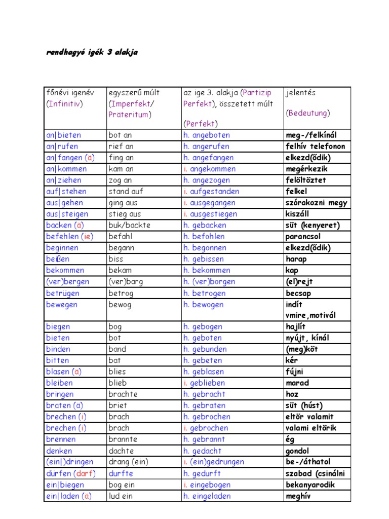 A vegyes igék annyiban különböznek az erős igéktől hogy nem csak megváltozik a tő hanem te ragot is kap az ige tehát a szabályos és a rendhagyó ragozás ötvöződik mert a többi rendhagyó ige nem kap te ragot. Erős és vegyes igékre vegyes ige pl. A 100 leggyakoribb német ige magyarul ragozással. Német mellékmondati szórend német nyelvtan 2 1 német mellékmondati szórend általános tudnivalók.